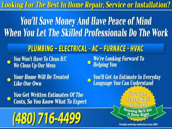 Call 480-716-4499 Were a service that has divisions in Plumbing and HVAC and Proudly Serving Phoenix East and Surrounding Area Choose Your Repair/Service Company Wisely - If You Hire the Wrong Company, You Could Have Dramatically Higher Costs and Future Problems Because They Didnt Fix the Problem Right the First Time... We Know Because Were the Company People Call To Clean Up Bad Jobs In Our Work We Have Pride -Quality Is What We Provide Easy To Understand Estimates High Quality Craftsmenship Dedicated and Devoted Call Now To Experience The High Quality Repair And Replacement Service Were Known For Our team of highly trained contractors has what it takes to get a job d 1 right. No matter how big or small your project may be, our team can help you to put everything in place Our business has satisfied numerous clients when it comes to their need for any and all home repairs and installations, no matter the size of the job, no job too big or too small. We help you achieve satisfaction through the services we provide. Whatever you need, we can help you with. Our contractors are rated 1 by most services and treat your home as if it were their own. Call 480-716-4499 Plumbing Plumbers Appliance installations Water Heater Installation Garbage disposal repair or replacement Kitchen Sink Kitchen faucet repair or replacement Sewage system Water heater repair or replacement Faucet Installation Faucet pressure Drain Clogs Rooter Water Heater installation & Repair Pipe Installation Toilet & urinal repair or replacement Bathtub Rooting Water Heater installation & Repair Hydro Jetting Service Garbage Disposal Installation Hot Water Recirculation System Full Service Plumbing and Drain Repairs, Commercial Rooter services Gas Leak Detecting and Repaired Low flow toilets. Drain cleaning Backflow prevention Water Line Service Leaky Faucet Plummer Tankless Water Heater System Toilet Repair/Install Toilet Installation Toilet Replace and Repair Drain Cleaning Installation of gas shut Copper Repipe and Repair Water filtration systems. Backflow / anti Hot Water Recirculation System Master plumber at affordable price water pipes Regulator Garbage Disposal Installation / Repair Bathroom Sink Rooting Drain Cleaning and Unclogging Sewer Lines Installed and Repaired Leak Detection Electric Trouble Shooting and Expert Repairs New Homes/Additions/Remodel Experts Custom Lighting Design Recessed Can Lighting Security Lighting / Landscape Accent Lighting Design Ceiling Fans/Exaust Fans/Attic Fans Electrical Services and Electrical Service UpgradesFuses and Circuit Breakers Code Correction/Code Compliance Repairs Electrical Safety Analysis Smoke Detectors / Carbon Monoxide GFCI Protection ARC Fault Protection Low Voltage Wiring Air Conditioning and Electric Heat Any Appliances / Water Heaters / Dryers / Ranges / Microwaves Hot Tubs / Jacuzzi Tubs Emergency Generators Electrical Roof and Gutter De-Icing Cable Trouble Shooting New and Old home repair specialists Storm Damage Service Equipment Repair Upgrade services fuse boxes to circuit breakers Code compliance/illegal and unsafe wiring Overloaded circuits Branch circuit faultstripped breaker/blown fuse Devices and light fixturesreceptacles, switches, GFCIs Underground wiring phone and cable TV All appliance circuitsranges water heaters, dryer, microwave, dishwasherCEILING LIGHTING Chandeliers Mini Chandeliers Flush Mounts Pendants Fluorescent Lighting Track Lighting Mini Pendants Semi Flush Mounts Recessed Lighting Island Lighting Billiard Lighting Lighting Accessories, Ceiling fans and exhaust fans attic fans Trouble Shooting and Expert Repairs New Homes/Additions/Remodel Experts Custom Lighting Design Recessed Can Lighting Security Lighting / Landscape Accent Lighting Design, Ceiling Fans, New installs , Replacing Wall switch, Remote control Ceiling Fans/Exhaust Fans/Attic Fans, Lighting, Recessed Lights installed 456, Chandeliers, Scants, Dimmers, Spotlights, Security Lights, Motion sensors, under the counter lights, accent lights. Surge Protection Dimmers Gfci & Arc Fault Protection Solar panels Underground Services Electrical Work Hot Tub Or Jacuzzi Wiring Electric heater Emergency Electrical Services Electricians Outdoor Lighting New Construction Install Lights Dryer & Oven Outlets Code Corrections Generator Installation Interior Lighting Electrican Residential Electrician Ceiling And Attic Fans Lighting For Fixtures Master Electrician Motion Sensor Lights Pool & Spa Wiring Indoor And Outdoor Lighting Light Switch Computer Circuits Smoke And C 02 Detectors Switch And Outlet Repair Dusk To Dawn Lighting Accent Lighting Doorbells Service Upgrades/Repairs Under Cabinet Lighting Lighting Installation Remodels Wiring Indoor Lighting Light Fixtures Solar Panel Installation Trouble Shooting Electrical Lighting In-Floor Heating Ceiling Fans Fan Installation Smoke Detectors Electrical Contractor Recessed Lighting Room Additions Hvac Wiring HVAC boiler boilers HVAC Systems Heating Heater Furnace repair Install HVAC Gas Heaters Installer Electric furnace replacement Air Conditi 1 r Repair Air Conditioning Install Air Condition Installation Roofing - New Roof Shingles Siding Local Roofing Company Asphalt Roofing Flat Roofs Industrial Roofing Roof Inspection Commercial Roofers Windows Siding Repair Asphalt Roll Roofing Metal Roof Storm Damage Home Roofing Roofers Roofing Repair Metal Roofing Roofing Contractors Roofing Wood fences Exterior Window Replacement Roofing contractor Certified Roofing Roof Replacement Wood decks Roofer Roof Repair Roofing Service Roofing Services Window Installation Reroofing Re Roof Wood Shingle Hail Damage Window Repair Gutter Install Gutters Gutter Cleaning Gutter Installation Seamless Gutters Painting Interior House Painters House painting House Painting Companies Painting contractors House painters Outside House Painting Interior Home Painting Home Painters Painting Paint Stripping Interior Painting Exterior Painting Service House Painter Paint Remo