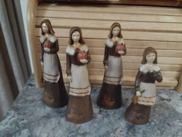 Pilgrim women figurines. I think they are made of some hard acrylic material. 3 of them are identical and are about 7.5 inches tall, each holding a pumpkin. The other is similar, but only 6.25 inches tall, holding grain or veggies in her hand. They have a price tag on the bottom of $7.00 - $7.50 each. They are in like new condition. Selling all 4 for $10.00 Cash. Call or text 360-448-9426. NO EMAILS!!!