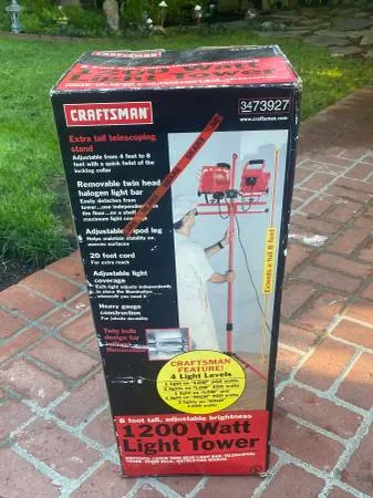 NEW UNOPENED STILL IN THE BOX CRAFTSMAN 1200 WATT LIGHT TOWER 4 ft TO 8 FT TELESCOPING STAND ADJUSTABLE BRIGHTNESS MODEL 3473927 MUST SEE SEE ALL THE PICTURES CONTACT TOM AT 141-526-0117