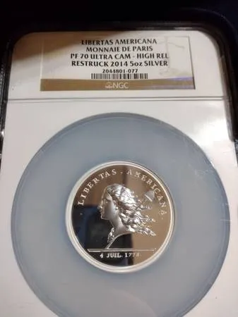 Absolutely stunning piece, new in the original mint slab case and includes the box and certificate of authenticity. Libertas Americana Monnaie De Paris, PF 70 Ultra Cam - High Relief, Restruck 2014 - 5 oz Silver. Serious inquiries only please, selling for $750, price is firm. Located In Aurora for pick up, contact Joe at 630-806-3310.