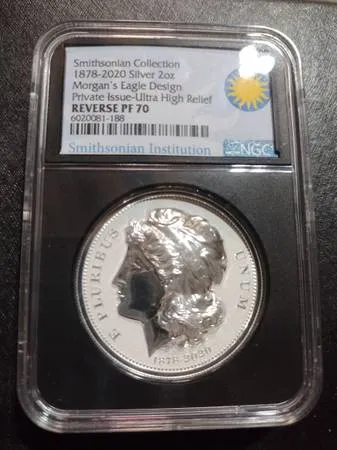 New in the original mint slab case. 1878-2020 Silver 2 oz Morgans Eagle Design Smithsonian Collection, Private Issue - Ultra High Relief Reverse Proof PF 70 silver coin - 2 oz fine silver. Serious inquiries only please, selling for $325, price is firm - Im not negotiating. Located In Aurora for pick up, contact Joe at 630-806-3310.