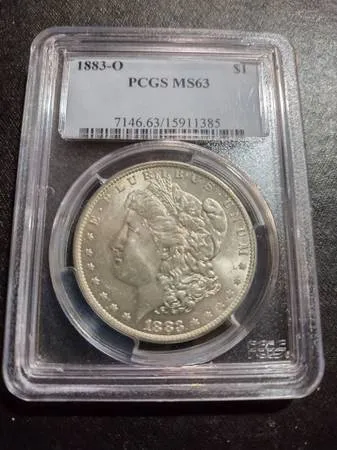 Beautiful coin, in the original graded mint slab case. 1883-O Morgan Silver Dollar, graded MS 63. Serious inquiries only please, selling for $90, price is firm. Located In Aurora for pick up, contact Joe at 630-806-3310.