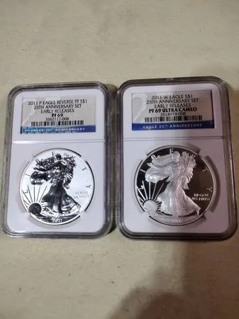 New in the original graded mint slab cases, NGC certified. 2011 W Eagle S$1 PF 69 Ultra Cameo, and 2011 P Eagle Reverse PF S$1. Early Releases, 25 th anniversary 2-coin set. Includes both coins as seen in photos, 21 ounce fine silver Eagle coins. Serious inquiries only please, selling the set of 2 for $260, price is firm. Located In Aurora for pick up, contact Joe at 630-806-3310.