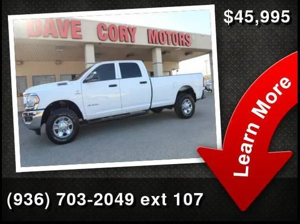 Dave Cory Motors address: 6445 I-45 North Fwy Houston TX, 77076 phone: 936-703-2049 ext 107 text: Text 107 to 936-703-2049 for more details : https://13904.dealerresources.net/l/60868568/2/23748434/107 contact: Our Sales Department 2022 RAM 2500 HD TRADESMAN CREW CAB LWB 4 WD 6.7 L CUMMINS TURBO 6-SPEED DIESEL Notes from the Dealer Visit Us at www.davecorymotors.com Vehicle Info Stock #: S 19387 VIN: 3 C 6 UR 5 HL 1 NG 292965 Condition: Used Odometer: 81003 Drivetrain Engine: Intercooled Turbo Diesel I-66.7 L/408 Cylinders: 6 Fuel Type: Diesel Transmission: 8-Speed Automatic w/OD Transmission Type: Automatic Drivetrain: 4 WD Body & Interior Exterior Color: White OEM Color Name: Bright White Clearco Interior Color: Black Doors: 4 Description 2022 Ram 2500 HD Tradesman Crew Cab LWB 4 WD 6.7 L Cummins Turbo Automatic 6-Speed Diesel Options 4 Wheel Drive., Tow Hitch., Power Steering., ABS., 4-Wheel Disc Brakes., Brake Assist., Steel Wheels., Conventional Spare Tire., Power Mirrors., Heated Mirrors., Intermittent Wipers., Privacy Glass., Power Door Locks., Daytime Running Lights., Automatic Headlights., AM/FM Stereo., Bluetooth Connection., MP 3 Capability., Auxiliary Audio Input., Adjustable Steering Wheel., Power Windows., Rear Bench Seat., Keyless Start., Cruise Control., A/C., Vinyl Seats., Split Bench Seat., Passenger Vanity Mirror., Bluetooth Connection., Power Door Locks., Power Windows., Split Bench Seat., Immobilizer., Traction Control., Stability Control., Traction Control., Front Side Air Bag., Telematics., Requires Subscription., Tire Pressure Monitor., Driver Air Bag., Passenger Air Bag., Passenger Air Bag Sensor., Front Head Air Bag., Rear Head Air Bag., Child Safety Locks., Back-Up Camera., Variable Speed Intermittent Wipers., Dave Cory Motors address: 6445 I-45 North Fwy Houston TX, 77076 phone: 936-703-2049 ext 107 text: Text 107 to 936-703-2049 for more details : https://13904.dealerresources.net/l/60868568/2/23748434/107 contact: Our Sales Department