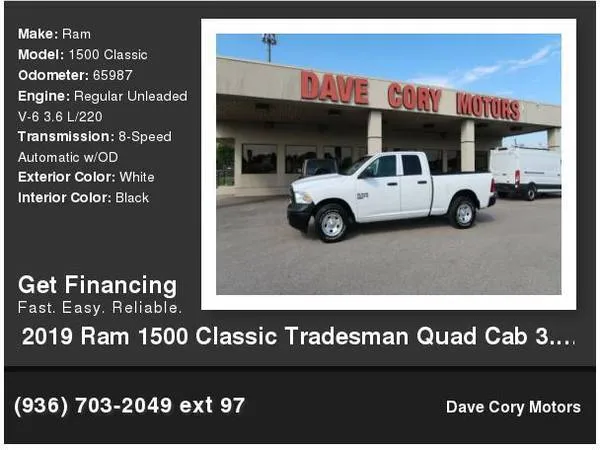 Dave Cory Motors address: 6445 I-45 North Fwy Houston TX, 77076 phone: 936-703-2049 ext 97 text: Text 97 to 936-703-2049 for more details : https://13904.dealerresources.net/p/60641171/2/23748429/97 contact: Our Sales Department 2019 RAM 1500 CLASSIC TRADESMAN QUAD CAB 3.6 L V-6 AUTOMATIC 8-SPEED ST Notes from the Dealer Visit Us at www.davecorymotors.com Vehicle Info Stock #: S 19365 VIN: 1 C 6 RR 6 FG 9 KS 740228 Condition: Used Odometer: 65987 Fuel Efficiency: 17/25 Drivetrain Engine: Regular Unleaded V-63.6 L/220 Cylinders: 6 Fuel Type: Gasoline Transmission: 8-Speed Automatic w/OD Transmission Type: Automatic Drivetrain: RWD Body & Interior Exterior Color: White OEM Color Name: Bright White Clearco Interior Color: Black Doors: 4 Description 2019 Ram 1500 Tradesman Quad Cab 3.6 L V-6 Automatic 8-Speed Gas Options Rear Wheel Drive., Tow Hitch., Power Steering., ABS., 4-Wheel Disc Brakes., Brake Assist., Steel Wheels., Bed Liner., Conventional Spare Tire., Power Mirrors., Heated Mirrors., Intermittent Wipers., Privacy Glass., Power Door Locks., Automatic Headlights., AM/FM Stereo., Auxiliary Audio Input., MP 3 Capability., Auxiliary Audio Input., MP 3 Capability., Auxiliary Audio Input., Rear Bench Seat., Adjustable Steering Wheel., Power Windows., Cruise Control., A/C., Vinyl Seats., Split Bench Seat., Auto-Dimming Rearview Mirror., MP 3 Capability., Power Windows., Power Door Locks., Split Bench Seat., Immobilizer., Traction Control., Stability Control., Traction Control., Front Side Air Bag., Tire Pressure Monitor., Driver Air Bag., Passenger Air Bag., Passenger Air Bag Sensor., Front Head Air Bag., Rear Head Air Bag., Child Safety Locks., Back-Up Camera., Variable Speed Intermittent Wipers., Dave Cory Motors address: 6445 I-45 North Fwy Houston TX, 77076 phone: 936-703-2049 ext 97 text: Text 97 to 936-703-2049 for more details : https://13904.dealerresources.net/p/60641171/2/23748429/97 contact: Our Sales Department