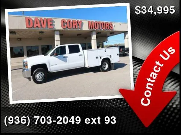 Dave Cory Motors address: 6445 I-45 North Fwy Houston TX, 77076 phone: 936-703-2049 ext 93 text: Text 93 to 936-703-2049 for more details : https://13904.dealerresources.net/p/61254441/2/23748425/93 contact: Our Sales Department 2019 CHEVROLET SILVERADO 3500 HD CC CREW CAB KNAPHEIDE SERVICE BODY WITH TOMMY GATE Notes from the Dealer Visit Us at www.davecorymotors.com Vehicle Info Stock #: S 19408 VIN: 1 GB 4 CVCG 7 KF 208654 Condition: Used Odometer: 130964 Drivetrain Engine: Gas V 86.0 L/366 Cylinders: 8 Fuel Type: Gasoline Transmission: 6-Speed Automatic Transmission Type: Automatic Drivetrain: RWD Body & Interior Exterior Color: White OEM Color Name: Summit White Interior Color: Gray Doors: 4 Description 2019 Chevrolet Silverado 3500 HD Crew Cab DRW Knapheide Service Body with Tommy Gate Liftgate 6.0 L V 8 Options Rear Wheel Drive., Tow Hooks., Power Steering., Steel Wheels., Tires - Front All-Season., Tires - Rear All-Season., AM/FM Stereo., MP 3 Capability., Bluetooth Connection., Auxiliary Audio Input., Bluetooth Connection., Split Bench Seat., Vinyl Seats., Rear Bench Seat., Adjustable Steering Wheel., Power Windows., Power Door Locks., Cruise Control., A/C., ABS., Dual Rear Wheels., Traction Control., Stability Control., Daytime Running Lights., Driver Air Bag., Passenger Air Bag., Driver Restriction Features., Locking/Limited Slip Differential., Dave Cory Motors address: 6445 I-45 North Fwy Houston TX, 77076 phone: 936-703-2049 ext 93 text: Text 93 to 936-703-2049 for more details : https://13904.dealerresources.net/p/61254441/2/23748425/93 contact: Our Sales Department