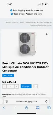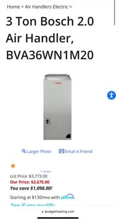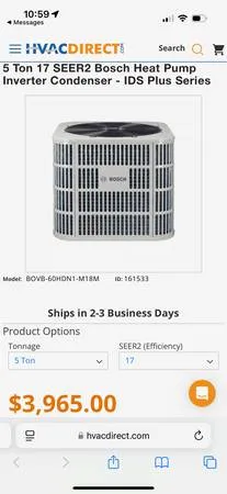 Retail $6500 plus tax 3 Ton Bosch 2.0 Heat Pump Inverter Condenser, model: BOVA-36 HDN 1-M 20 G 3 Ton Bosch 2.0 Air Handler, Model: BVA 36 WN 1 M 20 Calls or text 909-912-4072