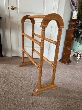 31 x 26 x 12 d. Solid oak wood heavy duty gorgeous and decorative rack, display stand quilt, towel, blanket and bedspread rack in perfect new condition. Call: 619-569-9995. Hi