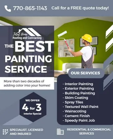 PROFESSIONAL PAINTER DRYWALL-CARPENTARY RESIDENTIAL AND COMMERCIAL SPECIAL!!! 10 OFF ON ANY JOB CALL US FOR ALL YOUR PAINTING NEEDS. *INTERIOR PAINTING *EXTERIOR PAINTING *TRIM INSTALLATIONS *SHEETROCK REPAIRS *REMODELING *COMMERCIAL AND RESIDENTIAL SENIOR CITIZEN DISCOUNT WHEN YOU MENTION THIS ADS. Residential painting services. House painters . Interior painting. Exterior painting. Professional painters. Painting contractors. Residential painting companies. Call Us Today: 770-865-1143