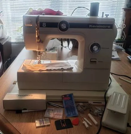See the test piece showing sewing machine works great. Its ready to sew!!!! Comes with everything you see pictured including hard case, cord, and foot pedal. Sears Roebuck Text me at 314-630-2952