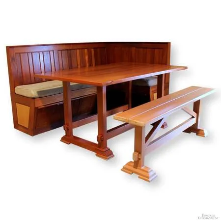 Copy and paste the below for more info https://upscaleconsignment.com/collections/furniture/products/custom-built-corner-dining-table-w-bench Custom Built Corner Dining Table w/Bench features a redwood finish, L-shape corner seating with removable seat cushions, 3 drawers with metal slides, a rectangular dining table, and a trestle bench. Condition = Good Cond. Upholstery = Microfiber Detail 5 = Mfr. Unknown Height:32 in. Width:40 in. Length/Depth:64 in. Item ID: 106063 Call for availability: 503.650.6351 STOP SPENDING TOO MUCH FOR FURNITURE! At Upscale Consignment, were picky because youre picky. We are the Northwests largest and highest rated furniture and jewelry consignment store. Thats why people who have the best gently-used furniture and jewelry to sell, choose to consign with Upscale Consignment. And thats also why we can be so choosy in what we accept. We reject far more than we accept, to ensure that our 22,000+ sq. ft. showroom has only the best quality, the best styles, and the best prices. Please dont confuse us with a thrift store! We dont sell cheap stuff cheap. You wont find anything dated, faded, worn, or torn at Upscale Consignment. Our only focus is to provide you with a large, ever-changing variety of high quality, brand name furniture and home accessories (and jewelry!) in like-new condition at 40% to 80% off the original purchase price. We also frequently carry a number of new items like showroom samples, discontinued and liquidation items, and close-outs! Our entire inventory (updated daily) can be seen online at: www.UpscaleConsignment.com Please visit us today, youll be glad you did! Hours: Monday-Saturday 10 am - 6 pm Sunday 10 am - 5 pm