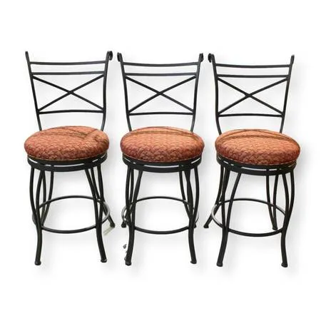 Copy and paste the below for more info https://upscaleconsignment.com/collections/furniture/products/set-of-3-iron-swivel-counter-stools Set of 3 Iron Swivel Counter Stools features black iron armless frames, X backs, round self-centering swivel seats with red & gold upholstery, curved iron legs, and round footrests/leg supports. Condition = Exc. Cond. Stool Qty. = 3 Stools Upholstery = Fabric Seat Width = Seat Width: 16 Swivel = Self-Centering Seat Height = Seat Height 24 Detail 5 = Mfr. Unknown Height:40 in. Width:16 in. Length/Depth:19 in. Item ID: 106065 Call for availability: 503.650.6351 STOP SPENDING TOO MUCH FOR FURNITURE! At Upscale Consignment, were picky because youre picky. We are the Northwests largest and highest rated furniture and jewelry consignment store. Thats why people who have the best gently-used furniture and jewelry to sell, choose to consign with Upscale Consignment. And thats also why we can be so choosy in what we accept. We reject far more than we accept, to ensure that our 22,000+ sq. ft. showroom has only the best quality, the best styles, and the best prices. Please dont confuse us with a thrift store! We dont sell cheap stuff cheap. You wont find anything dated, faded, worn, or torn at Upscale Consignment. Our only focus is to provide you with a large, ever-changing variety of high quality, brand name furniture and home accessories (and jewelry!) in like-new condition at 40% to 80% off the original purchase price. We also frequently carry a number of new items like showroom samples, discontinued and liquidation items, and close-outs! Our entire inventory (updated daily) can be seen online at: www.UpscaleConsignment.com Please visit us today, youll be glad you did! Hours: Monday-Saturday 10 am - 6 pm Sunday 10 am - 5 pm