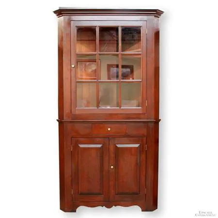 Copy and paste the below for more info https://upscaleconsignment.com/collections/furniture/products/red-mahogany-corner-cabinet Red Mahogany Corner Cabinet features a dark red mahogany finish over solids and veneers, two-piece configuration with a lighted glass door hutch, and a 2 door cabinet below. Condition = Exc. Cond. Wood Const. = Solids/Veneers Doors - Glass = 1 Glass Door Doors - Wood = 2 Wood Doors Drawer Qty. = 1 Drawer Hardware Color = Brass Lock & Key = No Key Shelves - Wood = 3 Wood Shelves Shelves-Adjust. = Adjustable Shelves Detail 1 = 2 Pc. Detail 3 = Dovetail Height:78 in. Width:41 in. Length/Depth:19 in. Item ID: 106101 Call for availability: 503.650.6351 STOP SPENDING TOO MUCH FOR FURNITURE! At Upscale Consignment, were picky because youre picky. We are the Northwests largest and highest rated furniture and jewelry consignment store. Thats why people who have the best gently-used furniture and jewelry to sell, choose to consign with Upscale Consignment. And thats also why we can be so choosy in what we accept. We reject far more than we accept, to ensure that our 22,000+ sq. ft. showroom has only the best quality, the best styles, and the best prices. Please dont confuse us with a thrift store! We dont sell cheap stuff cheap. You wont find anything dated, faded, worn, or torn at Upscale Consignment. Our only focus is to provide you with a large, ever-changing variety of high quality, brand name furniture and home accessories (and jewelry!) in like-new condition at 40% to 80% off the original purchase price. We also frequently carry a number of new items like showroom samples, discontinued and liquidation items, and close-outs! Our entire inventory (updated daily) can be seen online at: www.UpscaleConsignment.com Please visit us today, youll be glad you did! Hours: Monday-Saturday 10 am - 6 pm Sunday 10 am - 5 pm