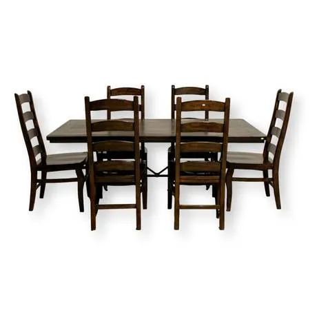 Copy and paste the below for more info https://upscaleconsignment.com/collections/furniture/products/pottery-barn-trestle-dining-table-w-6-chairs Trestle Dining Table w/6 Chairs features an espresso brown finish, a plank style table top, an iron trestle base with scrolled feet, and includes 6 Pottery Barn ladder back side chairs. Manufacturer = Pottery Barn Condition = Good Cond. Color = Dark Finish Side Chair Qty. = 6 Side Chairs Height:30 in. Width:40 in. Length/Depth:72 in. Item ID: 106092 Call for availability: 503.650.6351 STOP SPENDING TOO MUCH FOR FURNITURE! At Upscale Consignment, were picky because youre picky. We are the Northwests largest and highest rated furniture and jewelry consignment store. Thats why people who have the best gently-used furniture and jewelry to sell, choose to consign with Upscale Consignment. And thats also why we can be so choosy in what we accept. We reject far more than we accept, to ensure that our 22,000+ sq. ft. showroom has only the best quality, the best styles, and the best prices. Please dont confuse us with a thrift store! We dont sell cheap stuff cheap. You wont find anything dated, faded, worn, or torn at Upscale Consignment. Our only focus is to provide you with a large, ever-changing variety of high quality, brand name furniture and home accessories (and jewelry!) in like-new condition at 40% to 80% off the original purchase price. We also frequently carry a number of new items like showroom samples, discontinued and liquidation items, and close-outs! Our entire inventory (updated daily) can be seen online at: www.UpscaleConsignment.com Please visit us today, youll be glad you did! Hours: Monday-Saturday 10 am - 6 pm Sunday 10 am - 5 pm