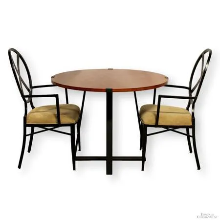 Copy and paste the below for more info https://upscaleconsignment.com/collections/furniture/products/wrought-iron-bistro-table-w-2-chairs Wrought Iron Bistro Table w/2 Chairs features a 40 round cherry finish table top, a black wrought iron base, and includes 2 oval medallion back chairs with tan microfiber seats. Condition = Good Cond. Color = Black Upholstery = Microfiber Detail 5 = Mfr. Unknown Height:30 in. Width:40 in. Length/Depth:40 in. Item ID: 106099 Call for availability: 503.650.6351 STOP SPENDING TOO MUCH FOR FURNITURE! At Upscale Consignment, were picky because youre picky. We are the Northwests largest and highest rated furniture and jewelry consignment store. Thats why people who have the best gently-used furniture and jewelry to sell, choose to consign with Upscale Consignment. And thats also why we can be so choosy in what we accept. We reject far more than we accept, to ensure that our 22,000+ sq. ft. showroom has only the best quality, the best styles, and the best prices. Please dont confuse us with a thrift store! We dont sell cheap stuff cheap. You wont find anything dated, faded, worn, or torn at Upscale Consignment. Our only focus is to provide you with a large, ever-changing variety of high quality, brand name furniture and home accessories (and jewelry!) in like-new condition at 40% to 80% off the original purchase price. We also frequently carry a number of new items like showroom samples, discontinued and liquidation items, and close-outs! Our entire inventory (updated daily) can be seen online at: www.UpscaleConsignment.com Please visit us today, youll be glad you did! Hours: Monday-Saturday 10 am - 6 pm Sunday 10 am - 5 pm
