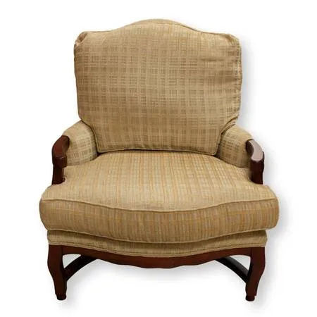 Copy and paste the below for more info https://upscaleconsignment.com/collections/furniture/products/cavalier-furniture-gold-fauteuil-chair Gold Fauteuil Chair features a brown cherry finish wood frame with curved arms, scalloped trim and tapered legs, gold upholstery with a textured square grid pattern, and reversible back & seat cushions. Manufacturer = Cavalier Furniture Condition = Exc. Cond. Color = Gold Upholstery = Fabric Seat Width = Seat Width: 28 Height:42 in. Width:37 in. Length/Depth:40 in. Item ID: 106123 Call for availability: 503.650.6351 STOP SPENDING TOO MUCH FOR FURNITURE! At Upscale Consignment, were picky because youre picky. We are the Northwests largest and highest rated furniture and jewelry consignment store. Thats why people who have the best gently-used furniture and jewelry to sell, choose to consign with Upscale Consignment. And thats also why we can be so choosy in what we accept. We reject far more than we accept, to ensure that our 22,000+ sq. ft. showroom has only the best quality, the best styles, and the best prices. Please dont confuse us with a thrift store! We dont sell cheap stuff cheap. You wont find anything dated, faded, worn, or torn at Upscale Consignment. Our only focus is to provide you with a large, ever-changing variety of high quality, brand name furniture and home accessories (and jewelry!) in like-new condition at 40% to 80% off the original purchase price. We also frequently carry a number of new items like showroom samples, discontinued and liquidation items, and close-outs! Our entire inventory (updated daily) can be seen online at: www.UpscaleConsignment.com Please visit us today, youll be glad you did! Hours: Monday-Saturday 10 am - 6 pm Sunday 10 am - 5 pm