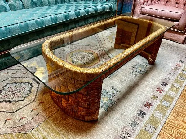 Great condition Palm beach regency style Glass top is 58 long, 22 wide, 1/2 thick Wicker base is 47 long, 21 wide and 16 tall 1 bottom corner has a little wear due to previous owners cat but not too noticeable Feel free to call or text me anytime at 133-983-2273