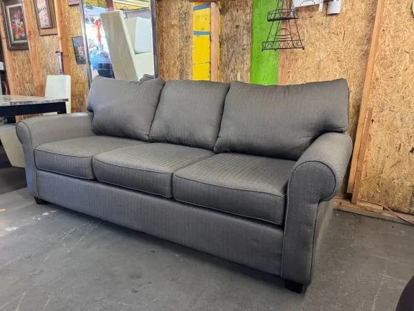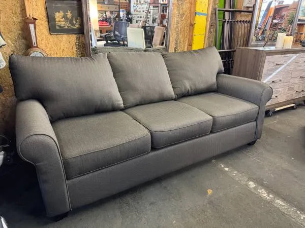 Contemporary Slate Gray Sofa Liken new condition Rolled arms Neutral charcoal gray upholstery Wood frame w/ hardwood Reversible seat/back cushions Wood legs Dimension: 88 W x 39 D x 38 H Seat cushion: 24 W x 26 D Pick up 415-867-4889
