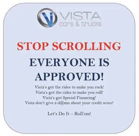 💥 CASH CARS – BANK REPOS – MECHANIC SPECIALS 💥 💥 SAVE THOUSANDS! SAVE THOUSANDS! SAVE THOUSANDS! 💥 💥 COME TEST DRIVE AND MAKE AN OFFER TODAY! 💥 👉🏼 BANK FINANCING - Good Credit - $100.00 Down* 👉🏼 SPECIAL FINANCING - Okay Credit - $500 Down* 👉🏼 IN HOUSE FINANCING - Bad Credit - $1500 Down* ⭐️ WE CAN and APPROVE EVERY 1 ⭐️ APROBAMOS a TODOS!! 💥 Your Social is NOT required!! 💥 Sin Seguro Social? No lo Necesitamos!! ☎️ Or Just Call Me Now – LAURAN 346-907-6508 👉🏼 Goto www.vistacars.com 👉🏼 Complete our online Credit Check Application ☎️ We will call you back with your Approval 🚘 Come test drive and take it home! ✔️ It is REALLY that Simple!! ✅ WE CAN and APPROVE EVERY 1 👇🏼 Copy and Paste this Link into your Browser to Get Approved 👇🏼 https://vms.autorevo.com/credit_application/new?id=cf 4 e 6 da 6-8 dfa-47 ca-8 b 4 e-883569 d 345 db&iid We Can Get You Riding Today !! We will work with you on the Down Payment!!! We accept the following: *SSI/Retirement Income *ID Only -You no longer need a DL to purchase an automobile *No Social Security-We Accept ITIN Numbers *NO PAY STUBS!! -Job letters and bank statements are accepted *First Time Buyers -Never Purchased a Vehicle? NO PROBLEM *Bad Credit and Previous Repossession -2 ND AND 3 RD CHANCES AVAILABLE *Bankruptcies-In a bankruptcy or finished with 1 We are here to help! *In House Approvals are based on Employment, Income and Down Payment *Plus Tax, Title and License Call Now 346-907-6508 ask for Lauran Call Now 281445-1800 ask for Lauran #acura #bmw #buick #cadillac #chevrolet #chrysler #dodge #ford #gmc #honda #hyundai #honda #infiniti #jeep #kia #lexus #lincoln #mazda #mini #nissan #ram #toyota 150025003500 #bighorn #longhorn #limited #accord #altima #armada #avalanche #avalon #camry #charger #civic #corolla #cts #equinox #escalade #escape #expedition #express #cargovan #f 150 #f 250 #f 350 #kingranch #platinum #crewcab #supercrew #fiesta #focus #grandcherokee #gs #highlander #juke #kick #lacrosse #malibu #impala #mdx #navigator #optima #promaster #qx 56 #qx 80 #rogue #sentra #versa #silverado #sierra #denali #sorento #suburban #tahoe #yukon #yukonxl #ltz #highcountry #traverse #tundra #tacoma #veracruz #wrangler #x 3 #xt 51000 down #inhouse #specialfinance #usedcars #usedtrucks