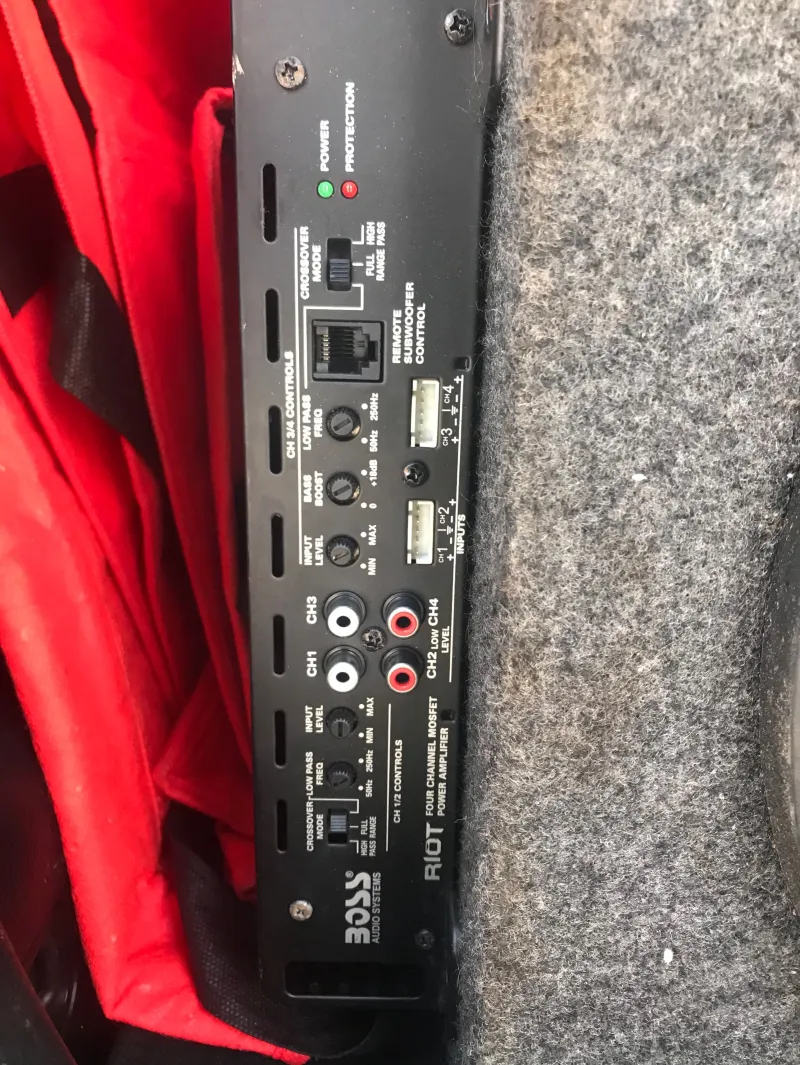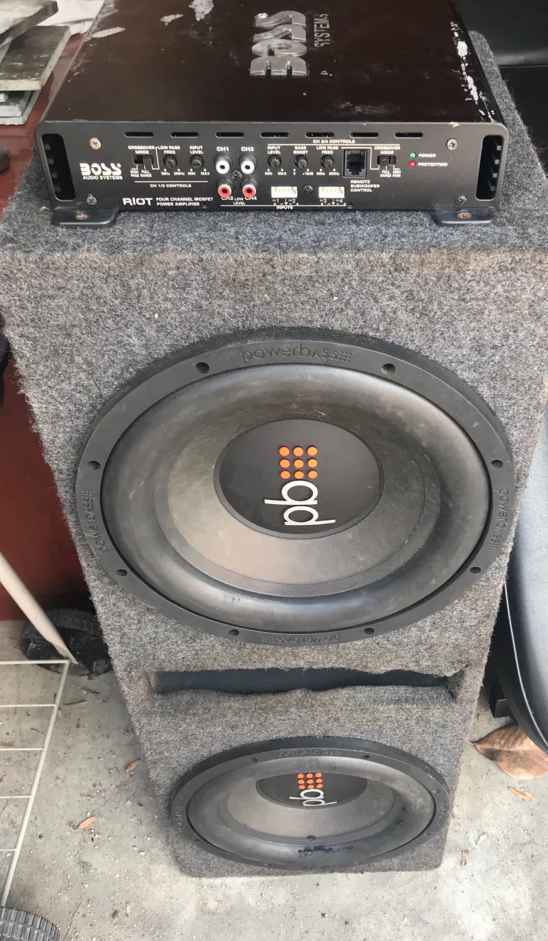 2 Power Bass 12” Speakers, speaker Box with breather And BOSS RIOT PRO 4 channel Amp (price negotiable) that’s just a scratch on the one speaker, not a puncture, both speakers work with no complications. Comes with box and amp
