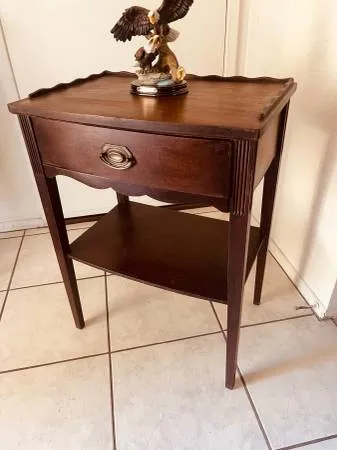 Up for sale my aunts end table, mahogany wood bedside table, accent table with drawer, this King George III style gem is absolutely museum quality piece. By acquiring antique items is like bringing a piece of history into your space. This heirloom piece carries stories, craftsmanship, and unique character that new items often lack. Plus, it contributes to sustainability by reducing waste and the demand for new resources. Whether it’s antique, vintage furniture, reclaimed wood decor, or repurposed art, these items add charm and personality to your home or office while honoring the past. Note -1- For any inquiries please text me or call me 818-809-8470. Note-2- If you see the item listed it means it’s available once sold I delete the listing immediately. We thank you sincerely for craiglisting and happy purchases to youf antique furniture, unfortunately I dont have nay clue as to who or where was this piece of furniture was made.