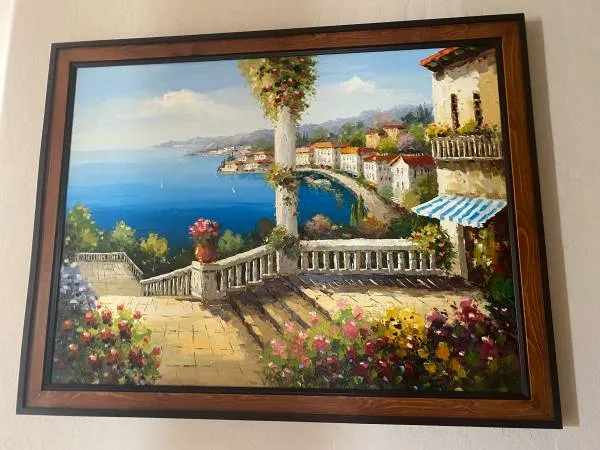 Beautiful brilliant colors oil on canvas with wood frame $400 Coastal, nautical, Mediterranean, seaside, Tuscany, Village Call or Email 505.985.8079