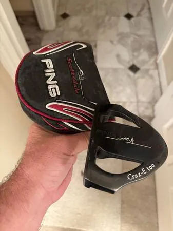 I am selling a PING SCOTTSDALE GRAZ-E-TOO BLACK DOT PUTTER WITH HEAD COVER. This Ping Mallet putter is in nice condition. It has the Ping Steel shaft with original Ping Black, Red/wine and white color grip. The putter measures 353/4. I am selling it for $200.00 Feel free to call me with questions at 408-482-0373. Keywords: Ping Craz-e- puter. Ping Craz-e-too