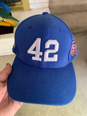 I am selling a 42 JACKIE ROBINSON 50 TH ANNIVERSARY BREAKING BARRIERS BASEBALL CAP. This cap is Jackie Robinson baseball cap is in excellent condition. It has embroidered patches with adjustable size strap. I am selling it for $20.00 Feel free to call me with questions at 408-482-0373 keywords: JACKIE ROBINSON 50 TH ANNIVERSARY BASEBALL CAP, JACKIE ROBINSON 4250 TH ANNIVERSARY BASEBALL CAP