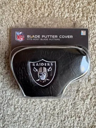 I am selling a NFL OAKLAND RAIDERS BLADE PUTTER COVER. This Raiders putter cover is brand new,never opened and its original package. It fits most blade putters. The cover has the Raiders embroiders logo. It has leather texture and a liner. I am selling it for $25.00 Feel free to call me with questions at 408-482-0373. keywords: OAKLAND RAIDERS NFL BLADE PUTTER COVER, NFL RAIDERS BLADE PUTTER COVER