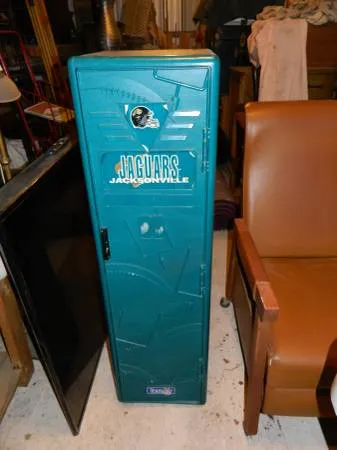 Please phone calls only and NOT text or email as it is a home phone with call screening to block robo calls. 817-238-0947. Ask about what else we have that you cannot live without and we may have it in our Storeage. Thanks! Locker measures approx 14 D x 14 W x 491/4 H and was made in 1994 for the Jacksonville Jaguars fans. With a little spray paint and stickers you can make it for your kids favorite team colors.
