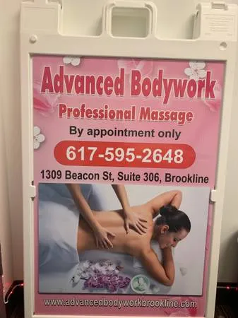 617-595-2648 or www,advancedbodyworkbrookline.com address: 1309 beacon st, Brookline Appointment Only & Cash Only Price: 1/2 hr $50 - 1 hr $70 - 90 mins. $120 Open 7 Days 10:00 AM - 8:30 PM The Benefits of Massage/Bodywork Relieves physical and emotional tension, promotes restful sleep, increases energy levels and contributes to your continued good health. Recognized as an effective and natural method of relaxing muscle spasms, decreasing muscle imbalance, improving flexibility and calming the nervous system. Improves the circulation of blood to your muscles, which increases the flow of nutrients, relieving muscle aches and fatigue. Increases the circulation of the lymphatic system, thereby boosting your immune system and making you less vulnerable to illness. Swedish Massage is the most effective technique for reducing and/or alleviating stress