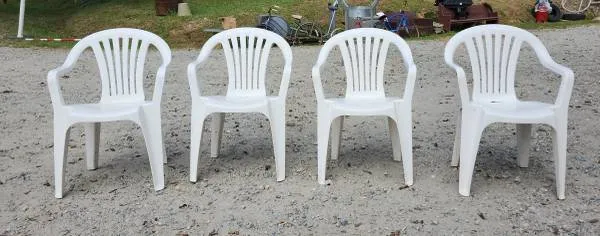 I am pleased to offer these 4 White Plastic Chairs. They are stackable and very lite. So they are easy to move around. They are pre-owned. 1 of them has a spot of discoloration in the seat. You can see it in the pictures above. I am asking $25 for the set OBO!!!!!! Taxes and Fees may apply for Pickup or Delivery. Please feel free to call or text Danny at 704-832-4110 with any questions or to schedule a time to pick up. Thank You! Items SKU: 020-0925-025 Measurements: Lengt...