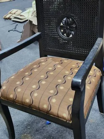 I am pleased to offer vintage-style chair with a cane back, a carved floral design, possibly a daisy. And a upholstered seat featuring a wavy, starburst pattern. I am asking $50 OBO!!!!!! Taxes and Fees may apply for Pickup or Delivery. Please feel free to call or text Danny at 704-832-4110 with any questions or to schedule a time to pick up. Thank You! Items SKU: 200-1025- 050 Measurements: Length: 24 Width: 21 H 8: 36 Condition: Great DF