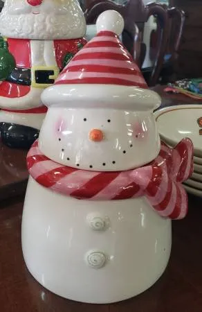 Snowman Cookie Jar I am pleased to offer this Pink and Red Snowman Cookie/Treat Jar. It was brought to us by Southern Season. It is pre-owned with signs of normal wear. There is some crackling in the ceramic. I am asking $20 OBO! Taxes and Fees may apply for Pickup or Delivery. Please feel free to call or text Danny at 704-832-4110 with any questions or to schedule a time to pick up. Thank You! Items SKU: 013-1124-020 Measurements: Length: 6.5 Width: 6.5 H 8: 9 Condi...