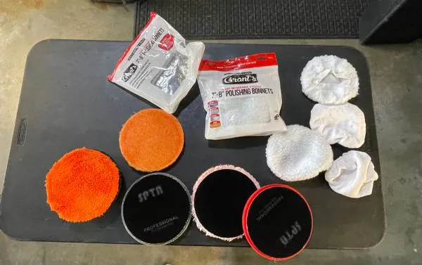 I have 2 bags of brand new bonnets and 5 polishing pads for sale. The pads are hook and loop. $20 for everything Text 208-914-6016