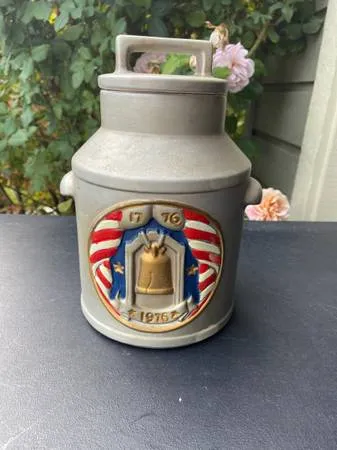 This is a 1976 McCoy ceramic USA Bicentennial cookie jar. It is modeled after a milk can. It is in nice condition $10 text 208-914-6016