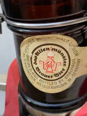 Empty Vintage 1980 s Das Altenmὓnster Brauer Bier Dark Brown Glass German Beer Bottle With Porcelain Metal Bails Rubber Stopper Cap For Sale $80.00. Text messages only 626-484-6063.