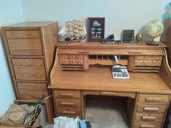 Nice oak roll top desk $400 firm 4 drawer oak file cabinet $400 firm 45 in tall 57 in wide 28 in deep desk Call or text 971-563-8730 Or email thru c/l