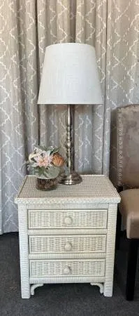 White Ratan Nightstand with 3 drawers 20 x 15 x 22 clean and fresh in like new condition $50 Cash only located Sparks Boulevard/Baring call or text 775-378-8162 Located off of Sparks Blvd/Baring Lamp add $25