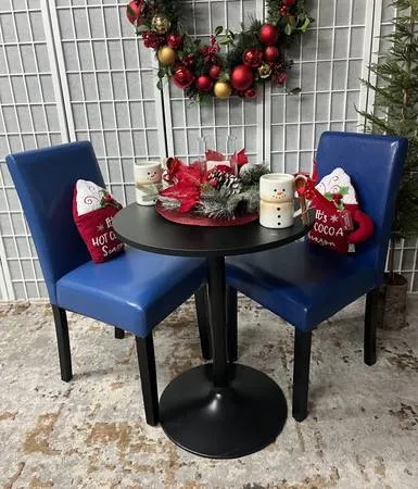 Little Black Table 24 x 30 and 2 NEW Blue Chairs. Great for an Apartment or small space $100 Cash only Call or text 775-378-8162 located off of Sparks Blvd/Baring