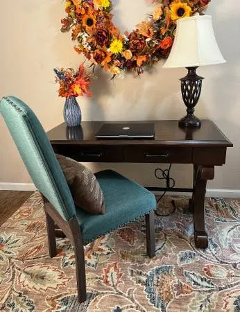 Gorgeous Dark Desk 48 x 224 x 30 with drawer has outlet for USB port and plug, NEW green Chair. Great for your Office or Study $175 set Cash only Call or text 775-378-8162 located Sparks Boulevard/Baring Lamp add $25
