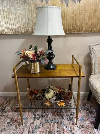 Glass and Gold Entry Table 30 x 18 x 30 with glass shelf in like new condition $75 Cash only call or text 775-378-8162 located off of Sparks Boulevard/Baring 2 are available Lamp add $25