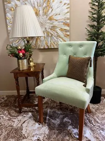 NEW Pale Green Velvet Accent Chair 21 x 24 x 39 Great for a Bedroom! $50 Cash only Call or text 775-378-8162 located off of Sparks Boulevard/Baring Side Table-sold Lamp add $25 Wall Art add $50