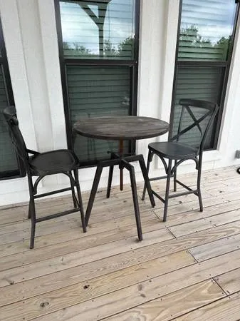 Cute Pottery Barn rustic bistro set included 2 counter h 8 chairs and adjustable table in blue/gray color. Excellent condition like new. Asking $350 obo call 512-584-7516.