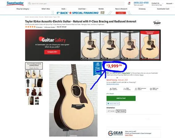 As pictured, this 2021 Taylor 814 CE, S/N: 120-624-1094. Reason for selling: Time to downsize and clear out unused items. This Taylor was purchased as a collectors guitar, less than 5-hours, has the original strings, in retail showroom mint condition, no dings, no scratches, brand-new mint condition, never outside, stored in smoke-free environment. See pictures, a new Tailor 814 CE retails at $3999 plus 6 tax $239.94 = $4238.94. Must provide name and cell / text number to schedule look and purchase., local area code 502 only. Cash deal, sale final, no returns, no trades, no shipping, local buyers only. Requires meeting at public bank in Cres 2 od, KY, teller will count the cash before buyer takes this beautiful Taylor. Make sure you are looking at Taylor 814 CEs that are WITHIN your budget range.