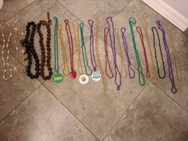 Bundle of 21 Festive Bead/Shell Necklaces for sale Different lengths, colors and holidays. Could be used to celebrate Mardi Gras, for a Halloween party, luau party or as table decorations $15 for the bundle Call or text Jeff 559-647-0611