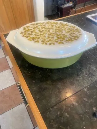 Vintage 70 s Pyrex 045 Green Casserole Dish 2-1/2 Qt with Olive theme Lid. $25.00, 509-951-1571.