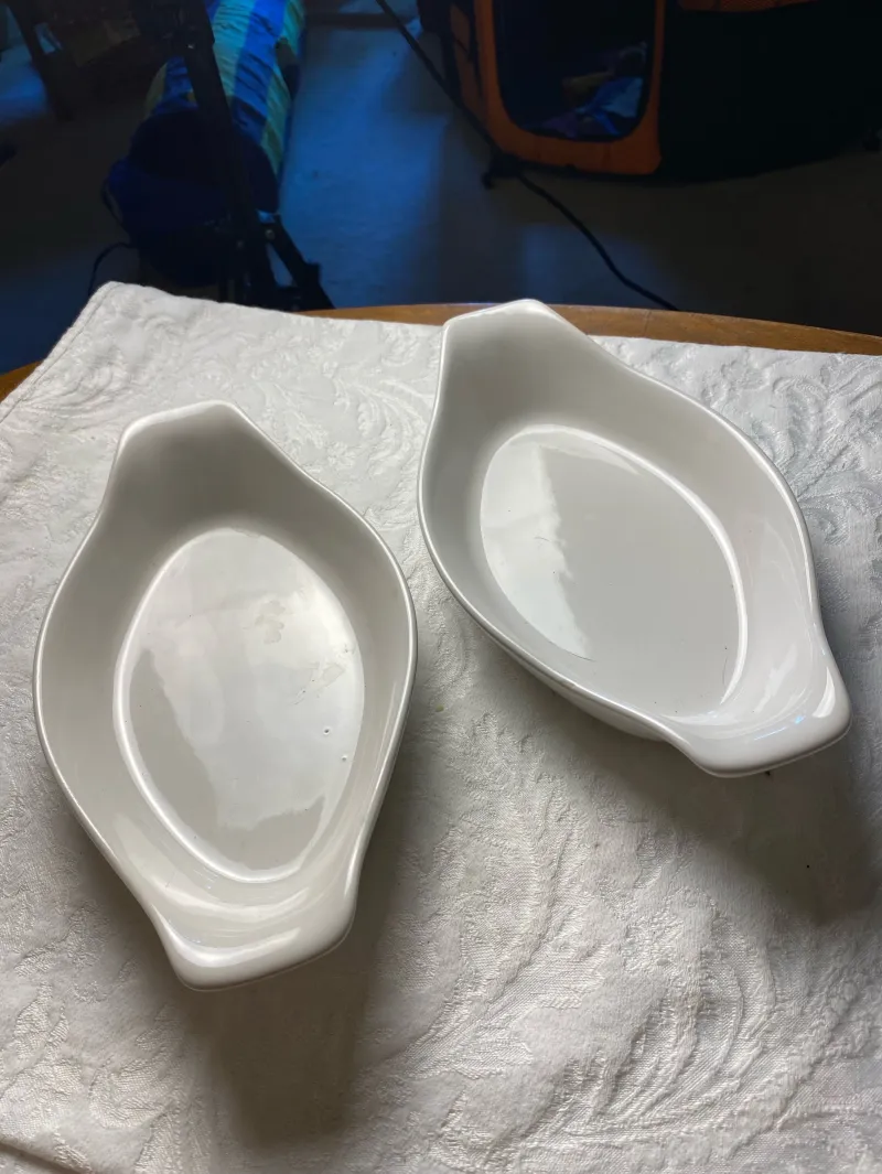 2 boat style white serving dishes. All exchanges are local pick up, cash only. The standalone Starbucks store at Cedar Plaza, Mountlake Terrace close to the entrance. Small parking lot to the left of Starbucks facing Cedar Way. 22805 Cedar Way/44th Ave West Mountlake Terrace 98043. NO Zelle, Venmo, Paypal etc. Cash only.