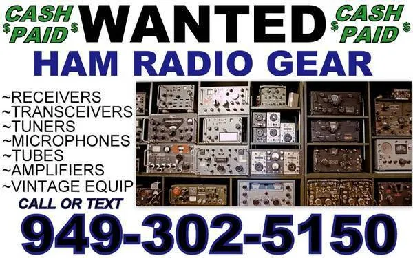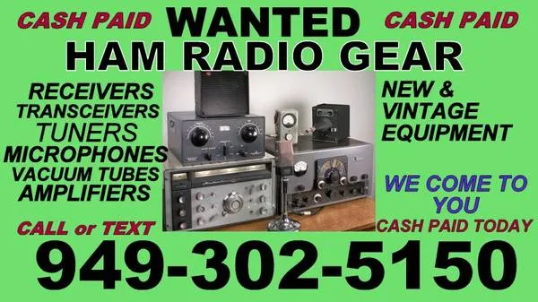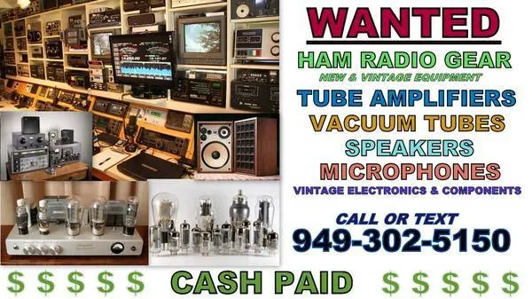 Paying top dollar for larger collections of Ham Radio Gear including radios, transmitters, linear amplifiers, tubes, telegraph keys, bugs, microphones, speakers, vacuum tubes, transceivers, receivers, hardware, accessories, etc. Collections considered should include at least 10 major pieces of equipment. Anywhere in southern California. We will travel to you, make an offer and pay cash up to $50,000 for major collections. Working condition not important, no collection too large for our budget! This ad NEVER EXPIRES - Always Looking! Dont throw ANYTHING away we will buy it all! Vintage electronics of all kinds! Radio Collections, Radio & TV Tubes, Test Equipment, Stereo Gear from pre-1980 s era, Recording Equipment, LARGER LOTS of comp 1 nts like: RESISTORS, CAPACITORS, Reels of WIRE, METERS, SOLDERING MATERIALS, Service Manuals & Brochures, Parts & pieces of parts, etc. Large Collections, Estates, and Hoards are PREFERRED. Call only if ready to sell NOW! Call or text anytime / texting photos is strongly recommended! 949-302-5150 Anywhere in CA, AZ, NV Admiral Ampex Audio Research BALDWIN Bell Bogen Dynaco EICO Emerson Fisher GE Grommes Grundig H.H. Scott Harman Kardon Heathkit KD Kenwood Knight Lafayette Luxman Magnavox Marantz McIntosh Philips RCA Sansui SCOTT Sherwood Siemens Sony Stancor Stromberg The Voice of Music Western Electric Zenith Acoustic Research Advent Aiwa Akai Allied Altec Lansing Ampex Audiovox Bang & Olufsen Blaupunkt Bogen Bose Boston Acoustics Bozak Bradford Cambridge Audio Carver Cerwin-Vega Channel Master Concept Concord Craig Crosley Denon Dual Electronics Dynaco EICO Electrophonic Electro-Voice Element Emerson Empire Fisher Garrard GE Grundig H.H. Scott Hallicrafters Harman Kardon Heathkit Hitachi ITT JBL Jensen JVC Kenwood KLH Knight Kyocera Lafayette LG Lloyds Luxman Magnavox Marantz Matsushita McIntosh MCS Mitsubishi Motorola NAD Nakamichi National NEC Nikko Olson Onkyo Optonica Panasonic Parasound Philco Philips Philmore Pi 1 er Polk Audio Proton Quad Quadraflex RadioShack RCA Realistic Revox Roberts Rotel SAE Samsung Sansui SANYO SCOTT Sharp Sherwood Shure Silvert 1 Sony Soundcraftsmen Soundesign Stewart Superscope SYLVANIA Tandberg Tannoy TASCAM TDK TEAC Technics Tektronix Tenna The Voice of Music Thorens TOA Toshiba Vector Research Westinghouse Xantech Yamaha Zenith a/d/s/ AAL ACDelco Acoustat Acoustic Research ADC Admiral Advent Aiwa Akai Allied Allison Altec Lansing Ampex Ampro Apogee AR Archer AT&T Atlas Audax Audio Logic Audiovox B&W BALDWIN Bang & Olufsen Becker Bell and Howell BIC Blaupunkt Bogen Bose Boston Acoustics Bowers & Wilkins Bozak Braun BSR Calrad Canton Carver Celestion CENTURY Cerwin-Vega Concord Coral Craig Criterion Crosley CTS Dahlquist dbx DCM Definitive Technology Denon Design Acoustics DLK Dual Electronics Dukane Dynaco Dynaudio EICO Electrophonic Electro-Voice Emerson Eminence Empire Energy Epicure ESS Fane Fisher Fostex Frazier Garrard GE Gem Sound Genesis Goodmans Grundig H.H. Scott Hafler Hammond Harman Kardon Heathkit Heco Hitachi Infinity Isophon ITT Janszen JASCO JBL Jensen JVC KEF Kenwood KICKER Klangfilm KLH Klipsch Knight Koss Kraco Lafayette LG Linn Lloyds LOMO Lorenz Magnavox Marantz Marshall Martin McIntosh MCS Memorex Midland Mission Mitsubishi Monitor Audio Montgomery Ward Mordaunt Short Motorola MTX Mullard NAD Nakamichi National NEC Norelco NuT 1 OHM Olson OMEGA Onkyo Optonica Oxford Packard Bell Panasonic Paramount Parasound Peerless Phase Tech Phase Technology Philco Philips Pi 1 er Polk Polk Audio Premier ProAc Pulse Quad RadioShack RCA RCF Realistic Revox RFT Roberts Rogers ROLA RSL Samsung Sansui SANYO SCOTT Seas Sharp Sherwood Shure Siemens Silvert 1 Snell Sonance Sonic Sony Soundcraftsmen Soundesign Sparkomatic Speakerlab Speco Spendor Stephens Trusonic Stromberg SYLVANIA Tandberg Tannoy TEAC Technics Techwood Tektronix TELEFUNKEN Tempest Tesla The Voice of Music Toshiba Triad Utah uxcell Vanco Vandersteen Vector Research Visonik Webster Electric Weltron Western Electric Westinghouse Wharfedale Yamaha Zenith AEA Alinco Allied Alpha Ameritron AMP Amperex Amphenol AnyT 1 Archer ARRL ARRL Astron Atlas Azden Baofeng BENCHER Bendix Blue BTECH Cobra Collins Comet Connex Cornell Dubilier Cushcraft Custombuilt Daiwa Delta Dentron Diamond Diamond Drake Eagle Eddyst 1 EF Johnson EICO Eimac Elecraft ETC Flex Galaxy GE General Gonset Hallicrafters HamGadgets Hammarlund Hammond Handmade Harris Heathkit Heil Heil Sound Henry Hi-Mound HP Hustler HYGAIN Icom INRAD ITT Jabra Jackson Jensen Jetstream Johnson Johnson Viking JRC Kantronics Kenwood Kit Knight Lafayette LDG LEIXEN Linear Mallory Marantz MFJ Micronta Midland Miller Mirage Motorola National Ohmite Olson OPEK Palomar Palstar Panasonic Philips Philmore PolyPhaser President QST Quansheng QYT Racal RadioShack Ranger RCA Realistic Regency Retevis RME Rogers Rohde & Schwarz RTL-SDR Samlex Sangean SCOTT Shure Siltronix Simpson Sinclair Stancor Standard Stryker Svetlana Swan TECSUN TeleType Tempo Tempo 1 TEN-TEC Teradyne Tesla Thordarson Tigertronics TPL TRAM TTI Tungsol TYT Uniden Watkins-Johnson Western Electric Westinghouse Workman WOUXUN Yaesu Youkits Zenith