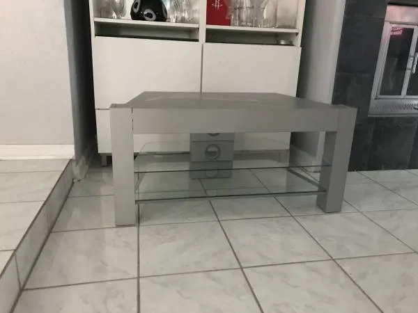 Contemporary Gray 2 Glass Shelf TV Stand Only. Very Good Condition. Minor nicks. If interested, please call text or e-mail. 713-560-3010. Dimensions: Width; 40 H 8: 19 Depth: 22 Can Sell TV Separately if interested. Phillips 26 TV.